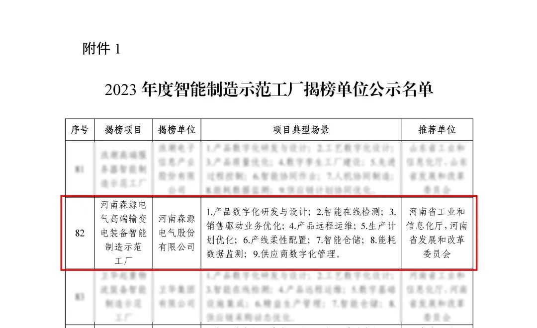 近日,工信部公示了《关于2023年度智能制造示范工厂揭榜单位和优秀场景名单》,公司凭借“河南久博电竞官网(中国)有限公司电气高端输变电装备智能制造示范工厂”项目成功入选2023年度智能制造示范工厂揭榜单位。