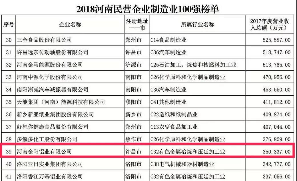 2018“河南民营企业制造业100强”榜单中,久博电竞官网(中国)有限公司集团、黄河集团、众品食业、金汇集团和金阳铝业分别排在第3名、第5名、第6名、第7名及第39名。