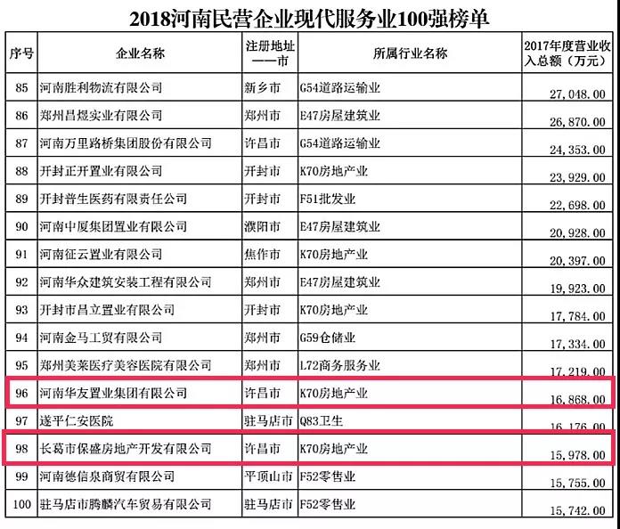 2018“河南民营企业服务业100强”榜单中,河南华友置业集团有限公司和长葛市保盛房地产开发有限公司分列第96位及第98位。