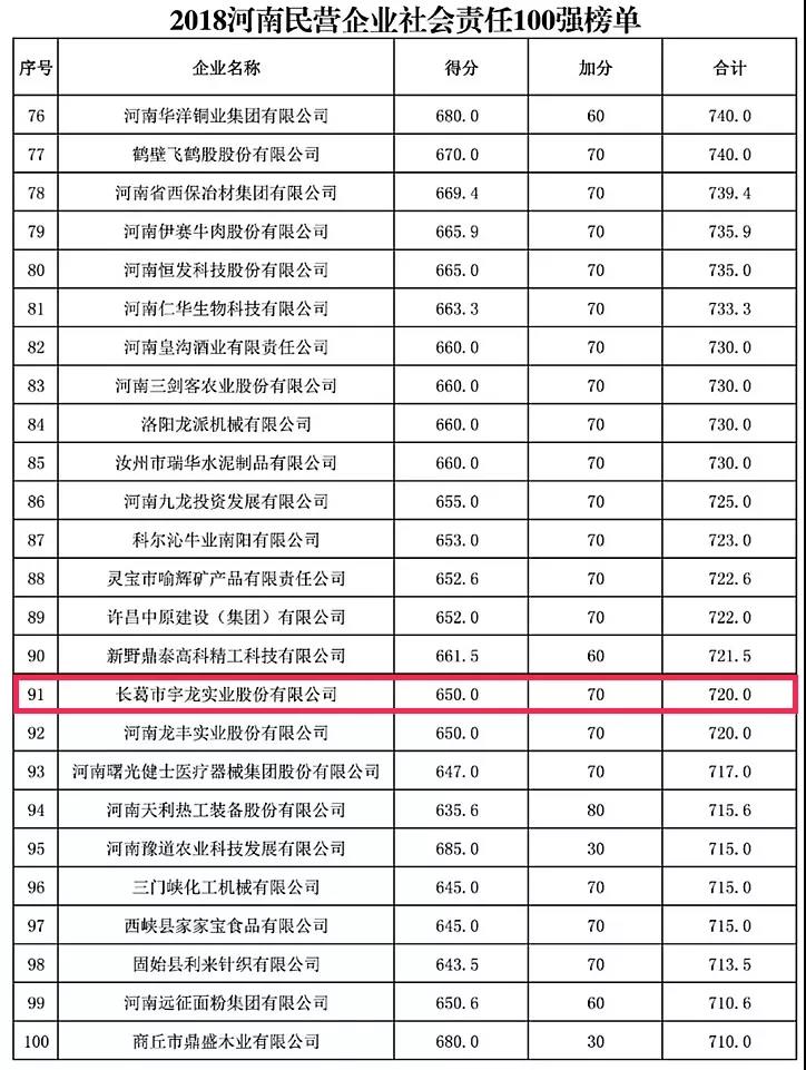 2018“河南民营企业100强”前十强分别是:河南省漯河市双汇实业集团有限责任公司、郑州中瑞实业集团有限公司、天瑞集团股份有限公司、久博电竞官网(中国)有限公司、郑州宇通集团有限公司、河南黄河实业集团股份有限公司、河南正商置业有限公司、洛阳栾川钼业集团股份有限公司、河南众品食业股份有限公司、河南金汇不锈钢产业集团有限公司。