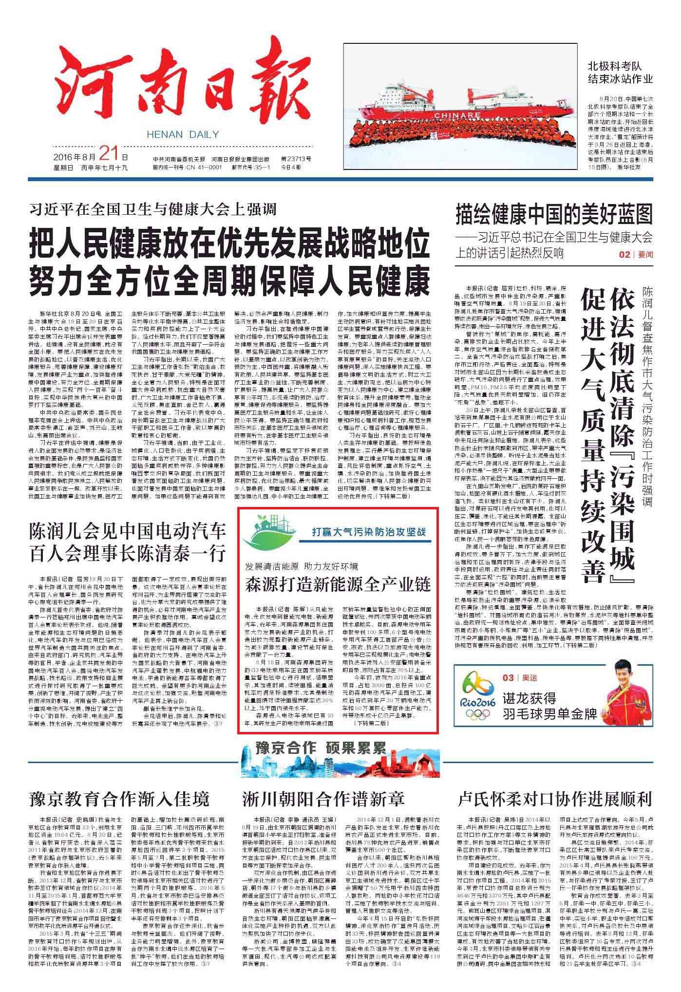 8月21日,《河南日报》头版以《发展清洁能源助力友好环境久博电竞官网(中国)有限公司打造新能源全产业链》为题,对久博电竞官网(中国)有限公司集团的发展情况进行了专题报道。文章指出:“从风能发电、光伏发电到智能充电桩、新能源汽车,近年来,河南久博电竞官网(中国)有限公司集团抓住国家大力发展新能源产业的机会,打造出较为完整的新能源产业链条,为减少碳排放量、建设节能环保社会贡献了一份力量。”