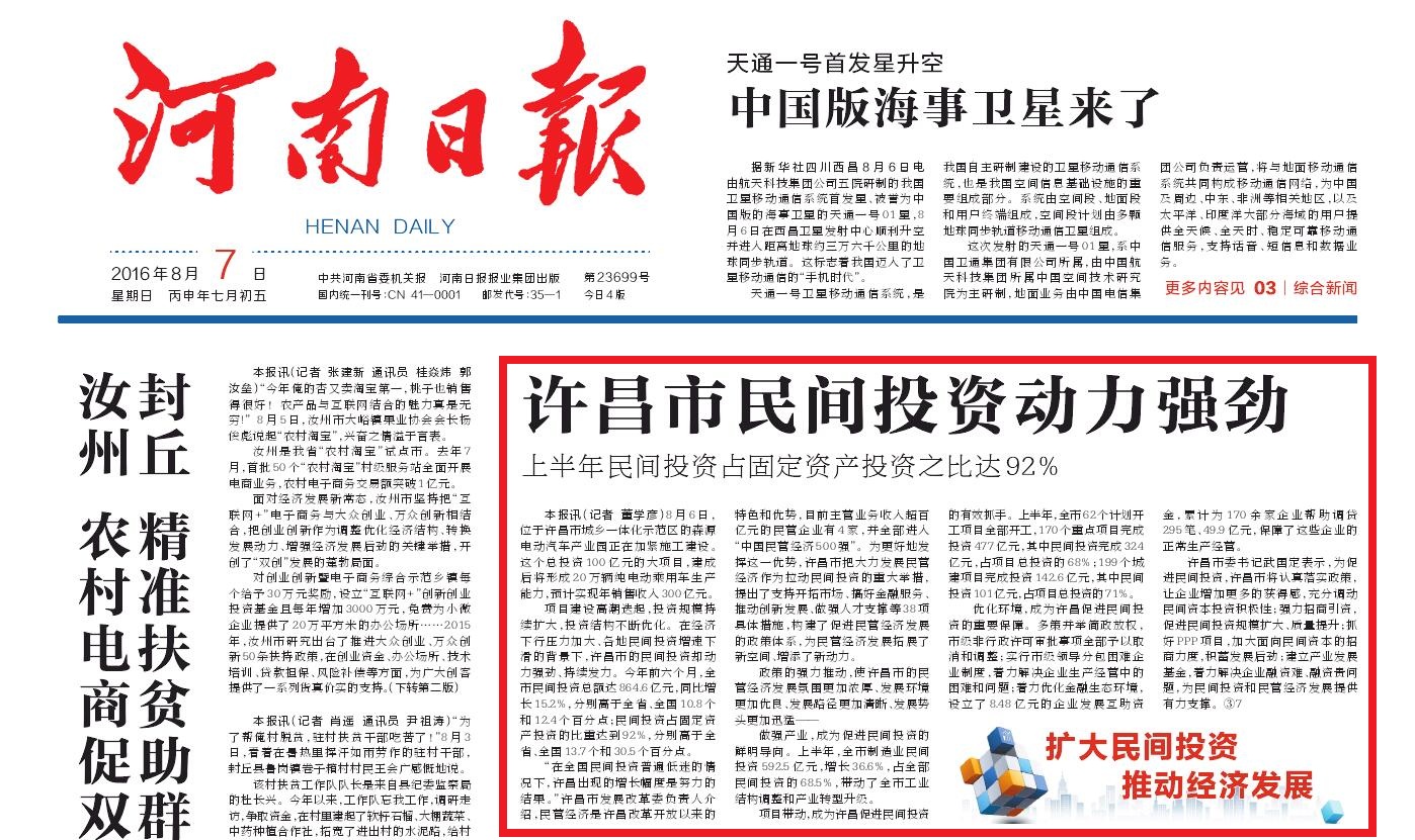 8月7日,《河南日报》在头版《许昌市民间投资动力强劲》一文中提到在经济下行压力加大、各地民间投资增速下滑的背景下,以久博电竞官网(中国)有限公司集团为典型代表的许昌市的民间投资,却动力强劲、持续发力。